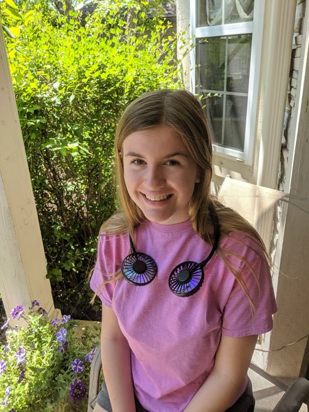 ⭐️⭐️⭐️⭐️⭐️ "My wife is a big oiler and found this phenomenal wearable fan for me.  It has 3 speeds and recharges, no batteries. You don't even remember you put it on, just keeps me cool. Great for grilling and walking. I rarely turn the light on but I did for my photo. My wife said she was glad she bought it for me, I'm little less crabby in the heat!" Roy Brostrom from Vernon Hills, Illinois